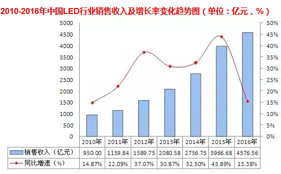 需求方面,2010-2016年,中国LED行业销售收入呈逐年增长趋势,其中2016年实现销售收入4576.56亿元,同比增长15.38%。