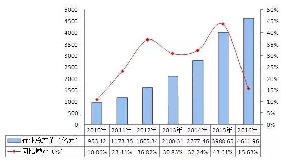 LED企业整体经营效益向好,源于LED产业产销规模的稳定增长。数据显示,2010-2016年,中国LED行业工业总产值呈逐年快速增长趋势,2016年实现工业总产值4611.96亿元,同比增长15.63%。